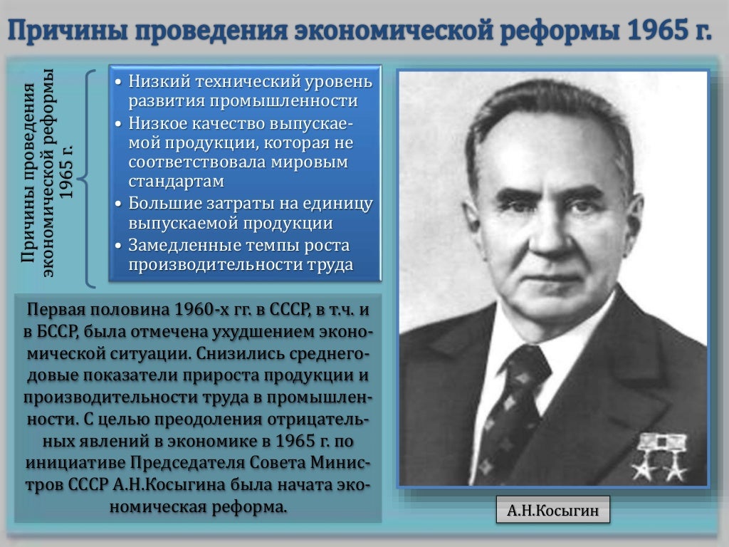 Последствия последний лет правления Хрущева были особенно ощутимы в экономической сфере. Новому руководству было очевидно, что без глубоких преобразований не обойтись. В середине 1960-х в стране проводятся экономические реформы. Большую роль в их проведении сыграл А.Н.Косыгин, председатель Совета министров.