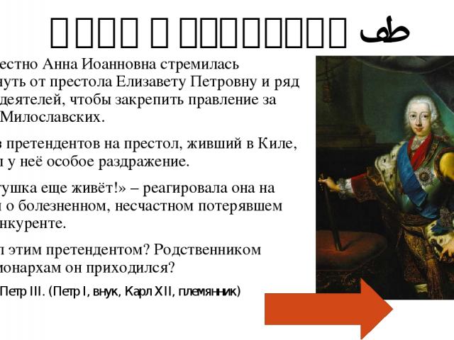 Стремясь продолжить династию Анна Иоанновна, назначила наследником престола своего внучатого племянника малолетнего Иоанна Антоновича.