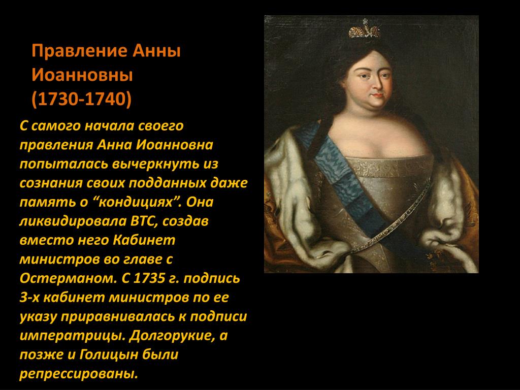 Однако отсутствие единства среди сторонников Верховного тайного совета, пытавшихся ограничить власть императрицы, позволило прибывшей в Москву Анне Иоанновне, при поддержке дворянства и гвардейских офицеров, вернуть себе все прерогативы и публично разорвать «Кондиции». Манифестом от 4 (15) марта 1730 г. Верховный тайный совет был упразднён, а через год на смену ему пришёл Кабинет министров, состав которого вошли А. И. Остерман, Г. И. Головкин, А. М. Черкасский.