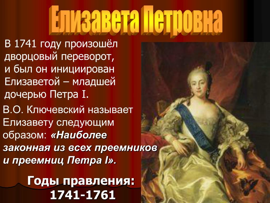 Эта неясность рассеялась в 1741 году, когда началось движение за отстранение якобы прогермански настроенной регентши и ее сына Ивана VI и за назначение Елизаветы императрицей. В ноябре того же года, поддержанная Алексеем Разумовским, Елизавета приняла роль законной претендентки на престол. Она возглавила отряд гвардейцев, схвативших регента и ее сына, а затем драматически провозгласила себя императрицей России.