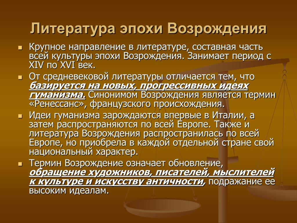 Эпоха Возрождения получила такое название из-за желания взять все ценное из культуры античности. Однако, культуру эпохи Ренессанса нельзя считать лишь калькой античной культуры. Во-первых, сохранялась христианская основа культуры. Во-вторых, получили развитие не только греческий и латинский языки, но и зародившиеся национальные языки европейских стран — итальянский.