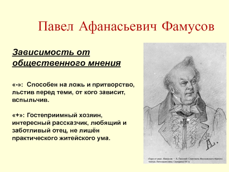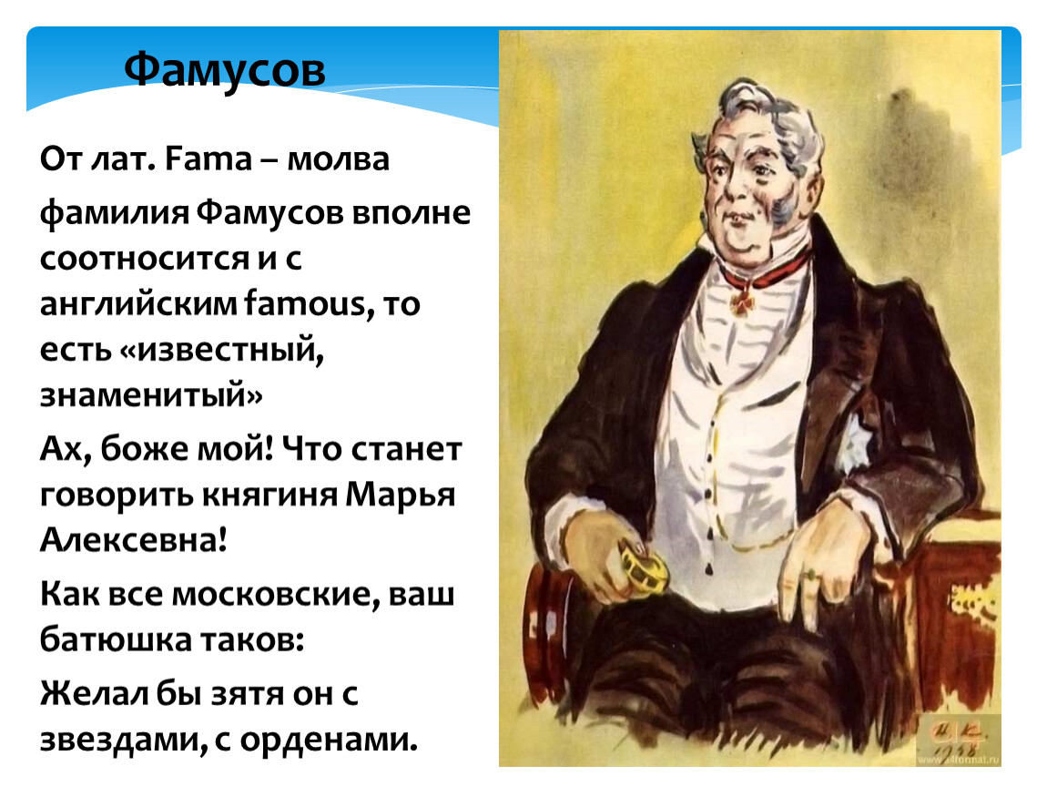 Недаром финальной фразой этого героя стало полное горечи восклицание: «Ах, боже мой! Что станет говорить княгиня Марья Алексевна!» К этому можно добавить, что фамилия Фамусов вполне соотносится и с английским famous, то есть «известный, знаменитый», что не менее важно в характеристике « московского туза».