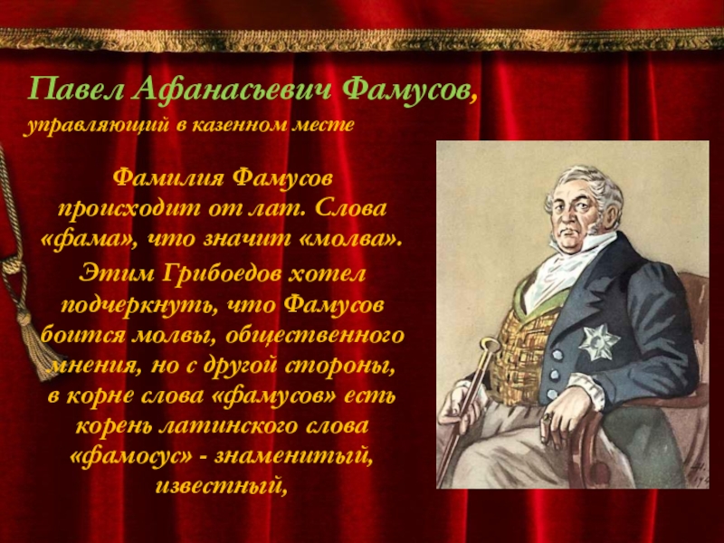 Проанализируем фамилию героя, в доме которого разворачиваются все действия комедии – Фамусова. Павел Афанасьевич Фамусов – управляющий в казенном доме, уважаемый в Москве человек. Он представитель «века минувшего» – консервативного дворянства, которое привыкло оценивать людей по их материальному благосостоянию, по наличию полезных связей в свете.