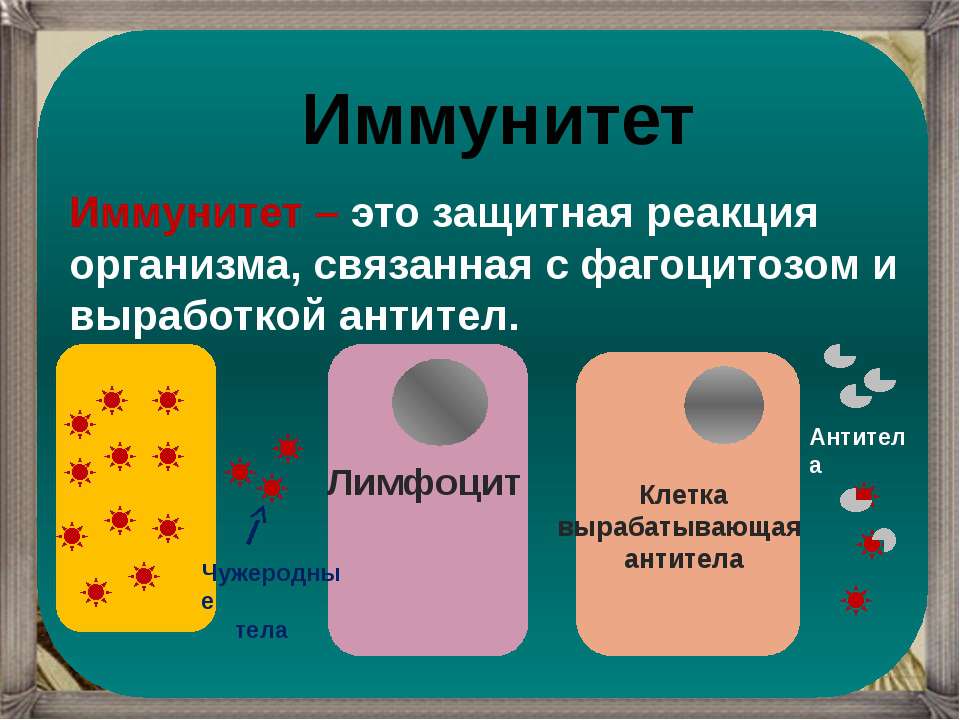 — Термин «иммунитет» происходит от латинского слова immunitas, что значит «освобождение». Феодальное право обозначало этим термином наличие у некоторых слоев населения привилегий, например освобождение от податей. Термин сохранился в качестве правового до наших дней и используется для обозначения неприкосновенности дипломатов — дипломатического иммунитета. Интересно, что в древности термином «иммунитет» обозначали также устойчивость к ядам, в том числе приобретенную благодаря приему их в малых дозах. Термин «иммунитет» с медицинским значением как «освобождение от болезни» впервые зафиксирован в 1869 году в словаре Литтре (Littrais). Луи Пастер вкладывал в это понятие близкий, но более конкретный смысл — снижение вероятности развития инфекционного заболевания после повторного заражения, т.е. после перенесенной инфекции. Современное понятие иммунитета более глубокое и комплексное и представляет собой способность организма создавать сложную иерархическую систему защиты от любых чужеродных агентов (антигенов), формировать иммунологическую память о контакте с такими агентами.