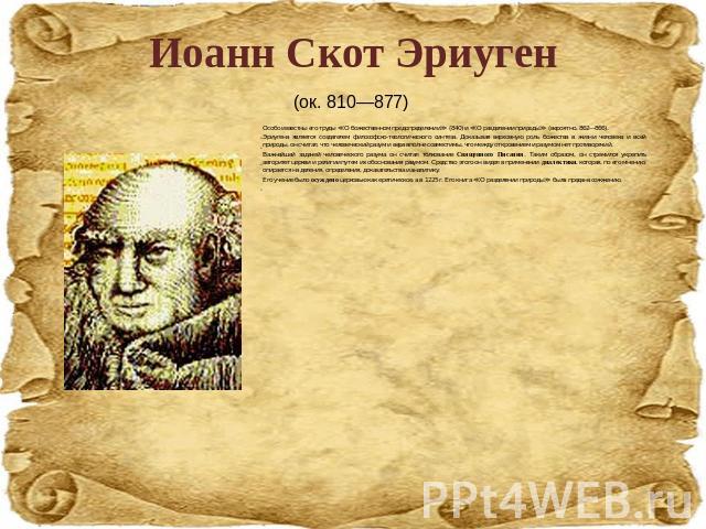 Иоанн Скот ЭриугенаПеревезенцев С. В. Иоанн Скот Эриугена (ок. 810—877 гг.) родился в Ирландии и на европейском континенте оказался примерно в 840-м г., когда был приглашен участвовать в теологическом споре о Божественном предопределении. Результатом участия в дискуссии стал написанный им трактат «О предопределении». Молодой ирландец, судя по всему даже не имевший священнического сана, выказал такое глубокое понимание христианского вероучения, что в конце 40-х гг. IX в. ему предложили занять место руководителя школы в Париже при дворе французского короля Карла Лысого.