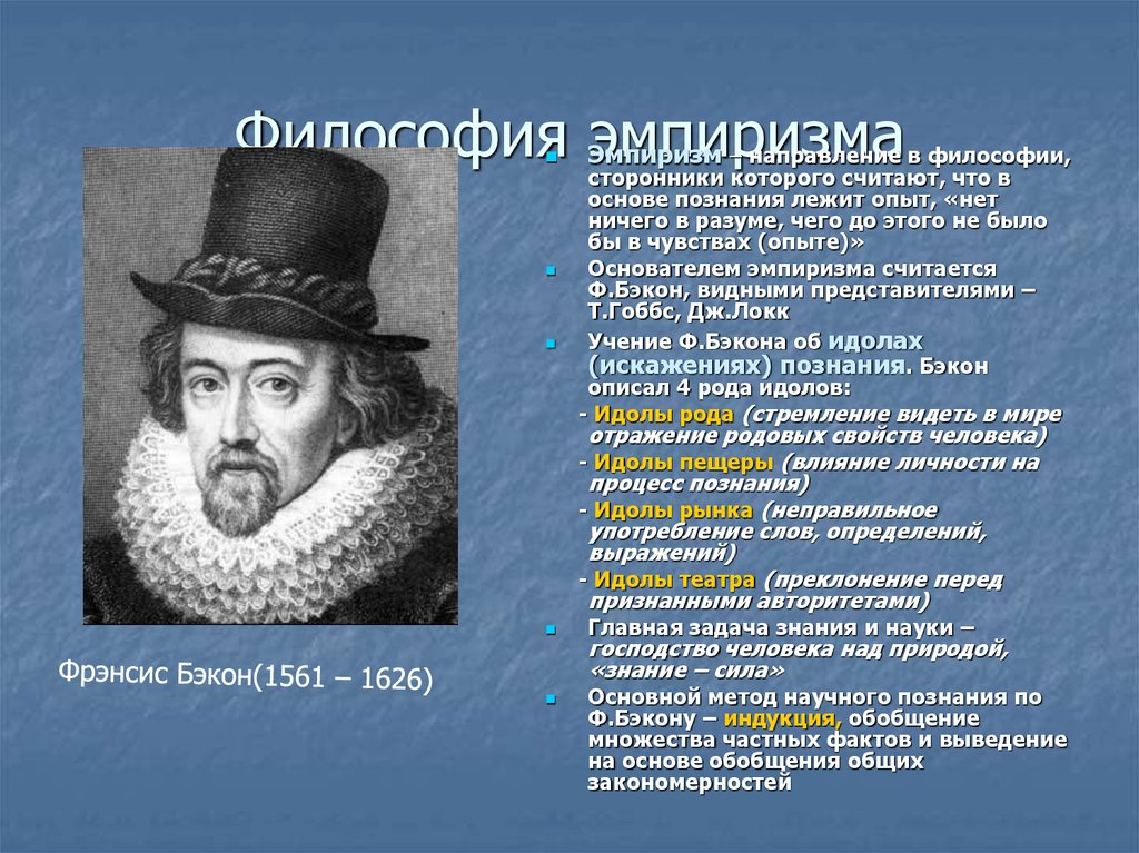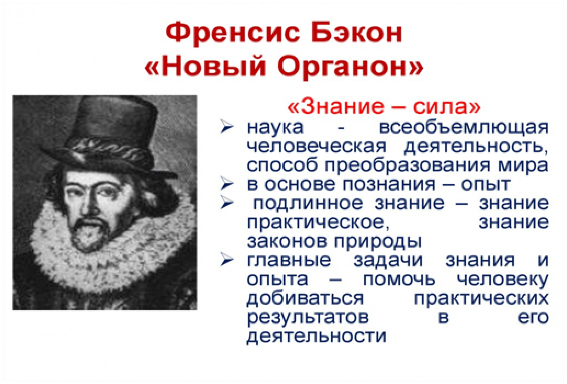 Будучи убежденным поборником религии, Бэкон в своих научных трудах говорил о том, что мешает развитию науки: идолы рода, пещеры, рынка и театра. «В познании Природы ум должен опираться только на Опыт» -утверждал он.