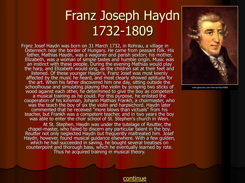 Франц Йозеф Гайдн родился 31 марта 1732 года в Австрии, в деревушке Рорау. Семья жила небогато, так как отец Франца был мастером по колесам, а мать кухаркой. Любовь к музыке юному Гайдну привил отец, увлекавшийся вокалом. В молодости отец Франца самостоятельно обучился игре на арфе. В 6 лет отец замечает у мальчика абсолютный слух и способности к музыке и отправляет Йозефа в близ лежащий город Гайнбург к родственнику, ректору школы. Там юный Гайдн обучается точным наукам и языку, но и к тому же игре на музыкальных инструментах, вокалу, поёт в хоре при церкви.
