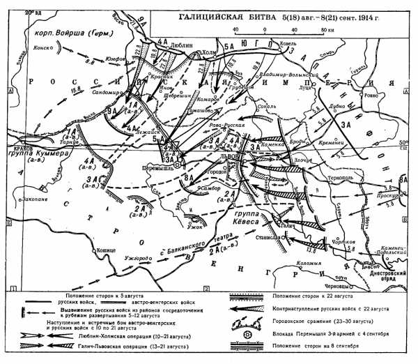Галицийская битва стала одним из крупнейших событий первой мировой войны: боевые действия велись на фронте протяженностью 400 км. Со стороны России в ней участвовало пять армий (3—5-я, 8-я и 9-я) и днестровский отряд. Со стороны противника — четыре армии и ландверный корпус. Потери Австро-Вен-грии составили до 400 тыс. человек (включая 100 тыс. пленных), России — 230 тыс. человек.