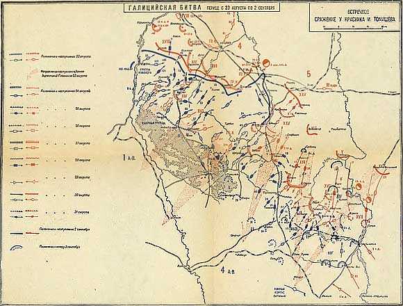 Встречное сражение у Красника и Томашева.В начале битвы военно-оперативная обстановка для русских войск складывалась неблагоприятно. 23 августа на Люблинском направлении 4-я русская армия барона Зальца в составе XIV, XVI и Гренадерского корпусов наступала к югу на 75-километровом фронте, имея ближайшей задачей разбить австрийцев, обнаруженных разведкой к северу от Таневской лесной полосы в 35 — 40 км к югу от исходного положения 4-й армии. Навстречу ей наступала 1-я австрийская армия Данкля в составе I, V и X корпусов, имея ближайшей задачей «разбить противника, сосредоточившегося у Красника, охватывая его левым крылом армии».