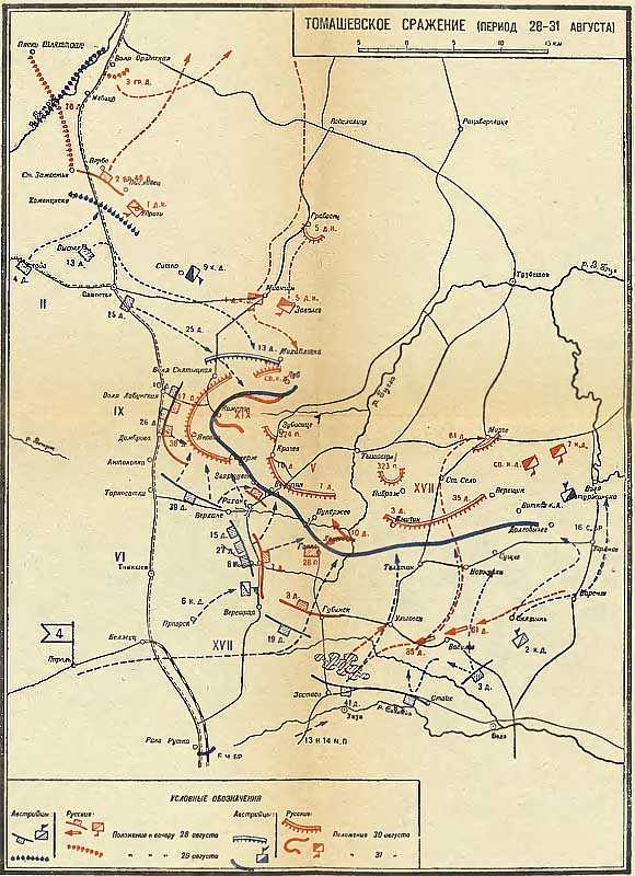 Томашевское сражение (период 28-31 августа).12 августа (25 августа) 5-я русская армия Плеве заняла следующее положение: 25-й корпус в контакте с левым флангом 4-й армии развернулся на высотах у Замостья, 19-й и 5-й корпуса сосредоточились против Томашова, 17-й корпус прикрывал операцию слева. Навстречу ей наступала 4-я австро-венгерская армия генерала Ауффенберга. План Ауффенберга, принятый 12 августа (25 августа), был основан на стремлении к двустороннему обходу 5-й армии русских.
