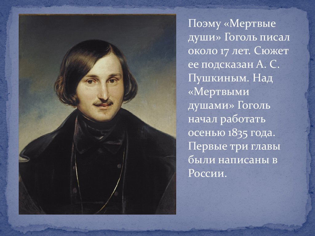 «Мёртвые души» являются одним из самых известных произведений, созданных Н.В.Гоголем. Первый том книги был выпущен в 1842 году, но работу над ним он начал ещё в 1835. Автор потратил на работу целых 17 лет упорного труда. Автор мечтал о создании большого эпического произведения, которое было бы посвящено России.
