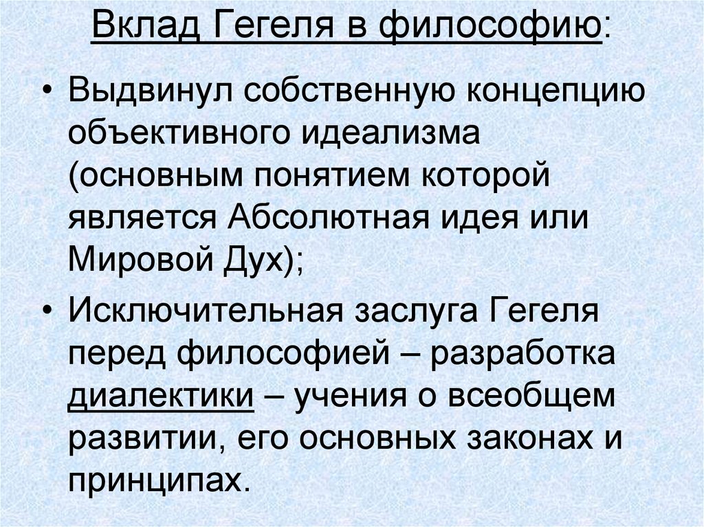 Гегелю, основой мира является абсолютная идея. Несмотря на это, роль Гегеля в истории философии чрезвычайно велика. Гегель разработал диалектический метод, исходивший из идеи развития, он стремился изучить все явления в беспрерывном движении и изменении, преобразовании и развитии, рассматривая внутренние противоречия в качестве источника развития. Правда, гегелевская диалектика была построена на идеалистической основе, а