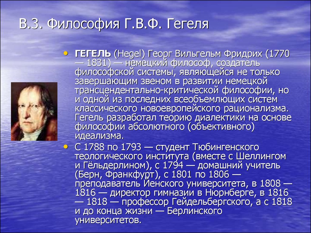 | Георг Вильгельм Фридрих ГегельГегель на кафедре. Классическая немецкая философия. ГегельБорьба между силами прогресса и силами реакции находила свое отражение во всех сферах политической и общественной жизни, а также в идеологии, накладывая на нее печать некоторой двойственности, противоречивости. Это особенно отчетливо проявилось в философии Гегеля, самого крупного представителя немецкой классической философии. Георг Вильгельм Фридрих Гегель (1770—1831) в юности горячо приветствовал Французскую революцию. В 1807 г., будучи профессором Гейдельбергского университета, он одобрительно относился к идее политических реформ. Переход Гегеля к реакционным взглядам наступил в 1818 г., когда он занял кафедру философии в Берлинском университете. Философское учение Гегеля окончательно оформилось в двух его крупнейших трудах — «Наука логики» (1812—1816) и «Энциклопедия философских наук» (1817 г.). Гегелевская система — это объективный или абсолютный идеализм; согласно