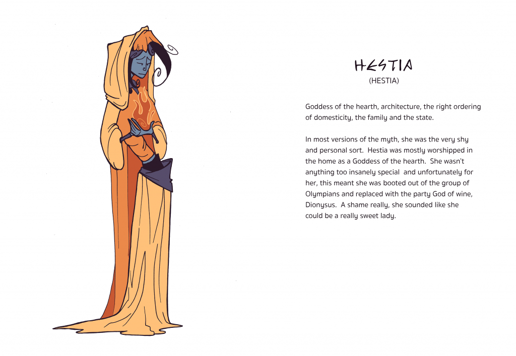 Гестия — одна из самых замечательных, уважаемых и скромных фигур древнегреческого Додекатеона. Дочь Кроноса и Реи, сестра Геры, Деметры, Посейдона, Зевса и Плутона, защитница семейной жизни. Она олицетворяет гармонию и счастье и является олицетворением честности и стабильности в супружеской и семейной жизни. Как старшая дочь правителя и повелительницы всего, Гестия с самого начала была Матерью всех богов.