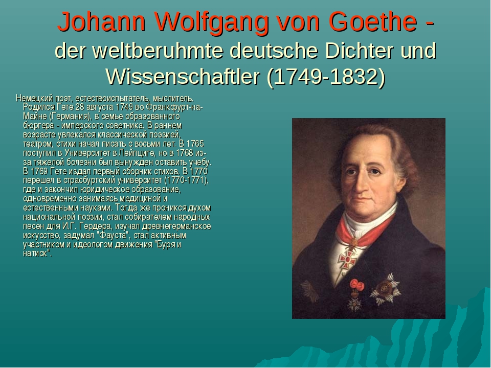 Иоганн Вольфганг фон Гете – известный немецкий писатель, которого считают основателем современной немецкой литературы. Иоганн Гете знаменит не только в Германии, но и во всем мире.
