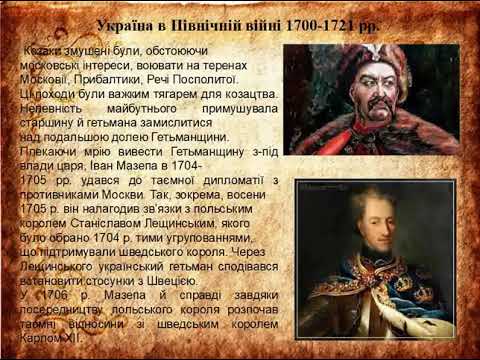 - Выдающийся украинский гетман Иван Мазепа урядовал более двадцати лет, добившись стабилизации внутренней жизни Украины и внешней политики в борьбе с наступлением русских царей на украинскую автономию .