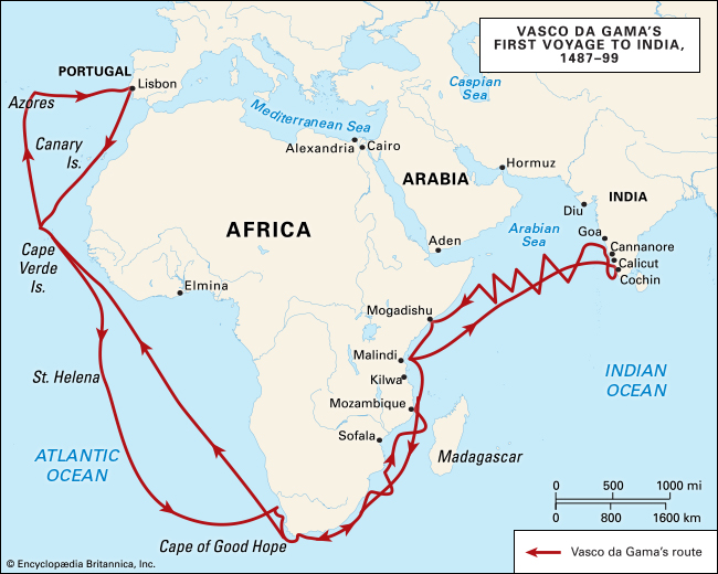 Обогнув мыс Доброй Надежды, да Гамма остановился в нескольких африканских странах для пополнения запасов. Затем он приземлился в Каликуте, Индия. Да Гама был первым европейцем, совершившим это путешествие!