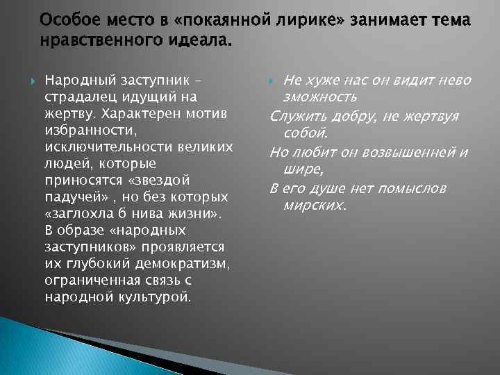 Результатом является постоянное раздвоение личности, постоянное чувство неправильность и даже «греховность» своей жизни, постоянное стремление пожертвовать собой, чтобы прийти на помощь неимущим и обездоленным, и, наконец, отправиться в «лагерь погибающих» — факт, нашла столь полное и яркое выражение в нашей литературе.