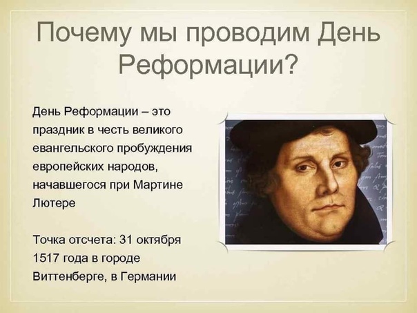 Среди духовных предшественников Мартина Лютера были такие люди, как Джон Уиклиф и Йоханнес Гус, которые пытались реформировать церковь в том же духе. Считается, что Реформация началась 31 октября 1517 года в Виттенберге, Саксония (на территории современной Германии).