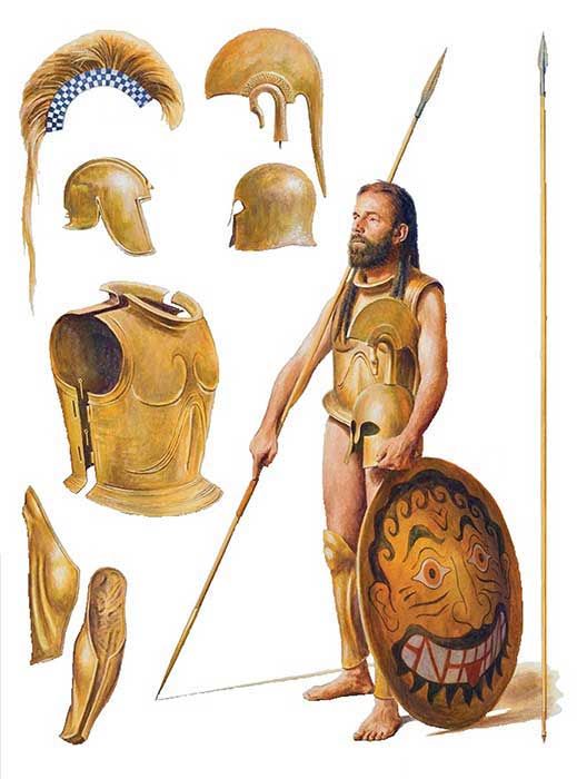 Основным оружием пехотинца-гоплита было длинное копье из ясеня ( дору ) и короткий меч ( ксифос ). Копье имело в среднем 2,5 метра (8 футов) в длину и было снабжено бронзовым или железным лезвием и четырехгранным шипом на конце (9).0143 зауротер ). Меч был также железным с прямым или иногда изогнутым лезвием ( machaira или kopis ) длиной не более 60 см. Без сомнения, многие гоплиты также носили с собой кинжал ( encheiridion ) в качестве дополнительной страховки. Защиту обеспечивал бронзовый шлем с кожаной подкладкой, который мог различаться по дизайну, часто имел гребень и защищал голову, шею и лицо. Корсет или нагрудник ( нагрудник ) из бронзы или кожи (позже для уменьшения веса он превратился в многослойный льняной жилет — линоторакс ), бронзовые поножи ( кнемиды ) для защиты голеней, иногда также носили нарукавники.