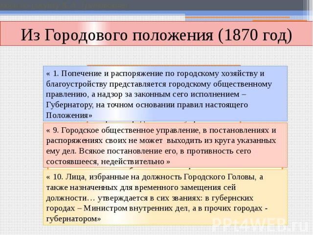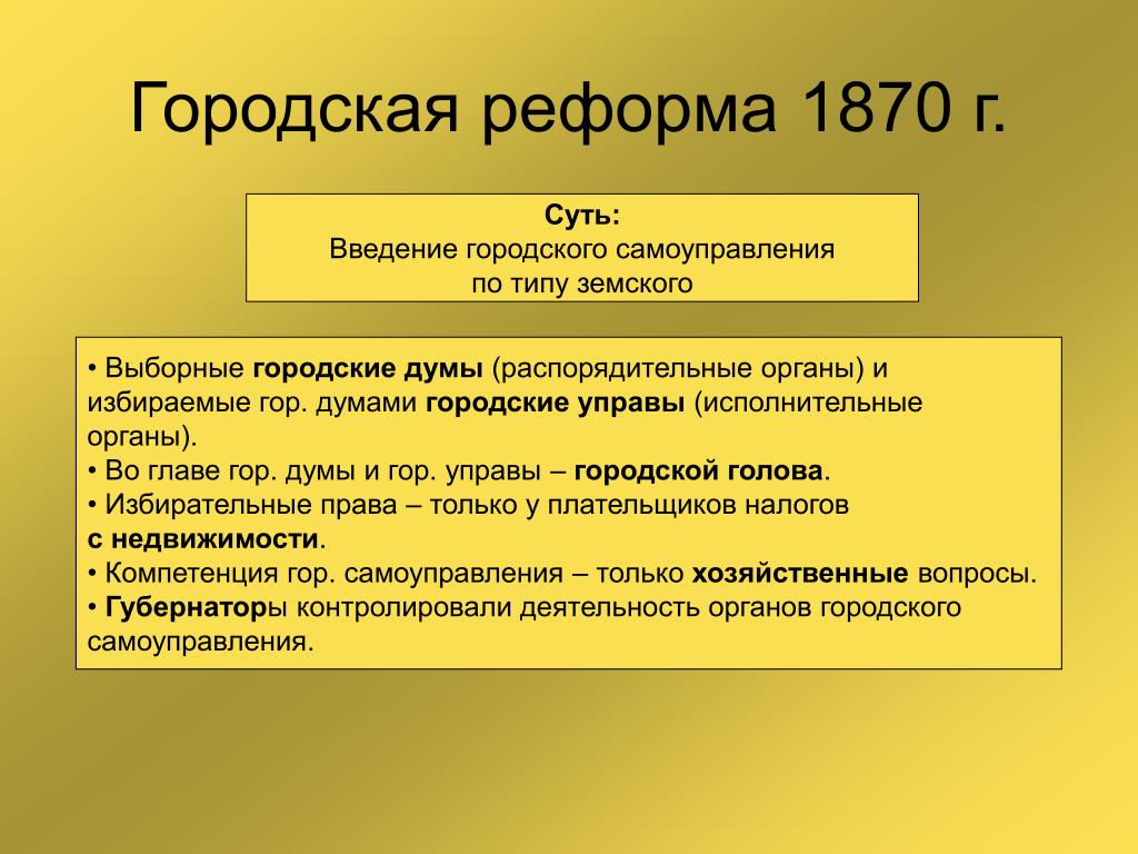 Городская реформа (реформа городского самоуправления 1870 года) — одна из основных реформ Александра 2 , призванная дать население городов самостоятельно заниматься ведением своего хозяйства и меньше зависеть от директив, идущих из центра.