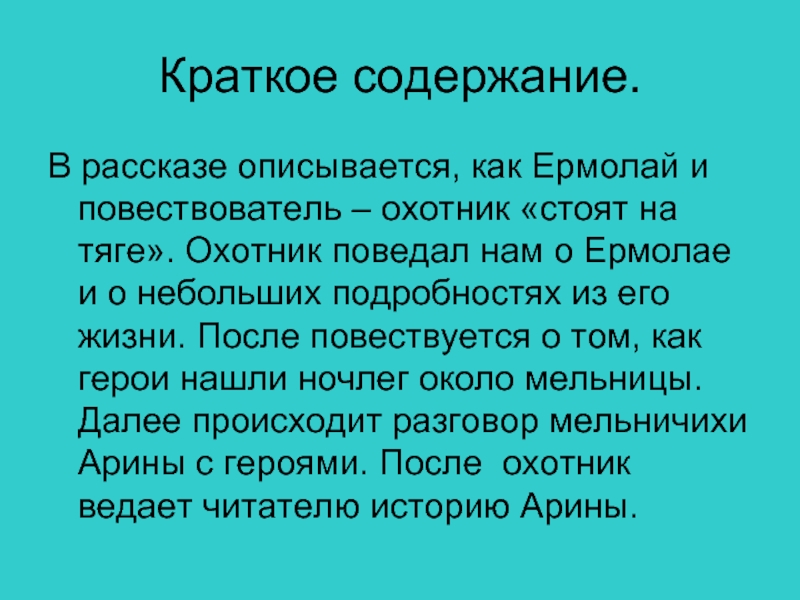 - «Ермолай и мельничиха», краткое содержание рассказа Тургенева