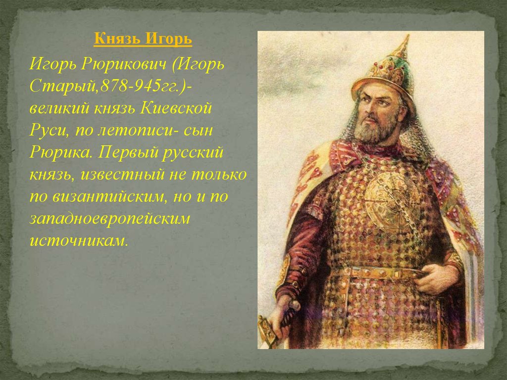 Князь Игорь – один из представителей династии Рюриковичей, который считается основателем Древней Руси. Является наследником Рюрика и Ольги, отцом Святослава.