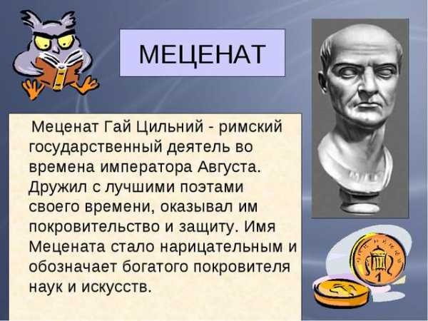 ИсточникТакже при правлении Императора Августа, его друг — богатый римский гражданин Меценат, поддерживал талантливых людей деньгами, чтобы они имели время для творчества. Имя Меценат стало нарицательным. Так и сегодня называют покровителей искусства, своими деньгами способствующих его развитию.