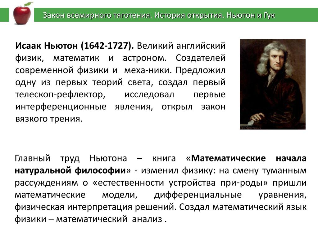 Открытый им закон всемирного тяготения опирался на простую мысль (для Ньютона), что Луну удерживает на орбите та же сила, что заставляет известное яблоко Ньютона падать с яблони на землю. Ньютон не останавливается на констатации этой мысли, он доказывает, что центростремительная сила, которая действует на Луну, может быть рассчитана в соответствии с открытым им законом: «Всякое тело, падающее на Землю, притягивается ею с силой, обратно-пропорциональной квадрату расстояния от этого тела до центра Земли, и прямо пропорционально произведению масс этих тел». Эту закономерность И. Ньютон распространил и на движение планет и спутников Юпитера, на явления приливов и отливов и т. п.