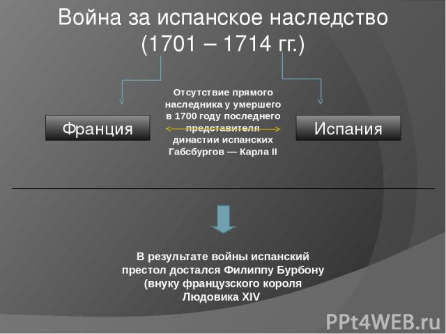 В 1698 Людовик XIV заключил с англ. королём Вильгельмом III Оранским соглашение о признании Иосифа Фердинанда наследником престола и разделе исп. владений в Италии и Нидерландах между Францией и Австрией. После смерти в 1699 Иосифа Фердинанда было подписано новое соглашение, по которому наследником исп. престола объявлялся эрцгерцог Карл, а исп. владения в Италии переходили к Франции. Этот договор вызвал недовольство в Испании и Австрии. Незадолго до своей кончины Карл II подписал завещание в пользу Филиппа Анжуйского. В 1700 последний взошёл на исп. престол под именем Филиппа V, после чего Людовик XIV денонсировал договор о разделе исп. владений. В февр. 1701 он объявил своего внука наследником франц. престола, дав ясно понять, что намерен объединить обе страны под властью одной короны. Планы Людовика XIV встретили серьёзное сопротивление со стороны европ.