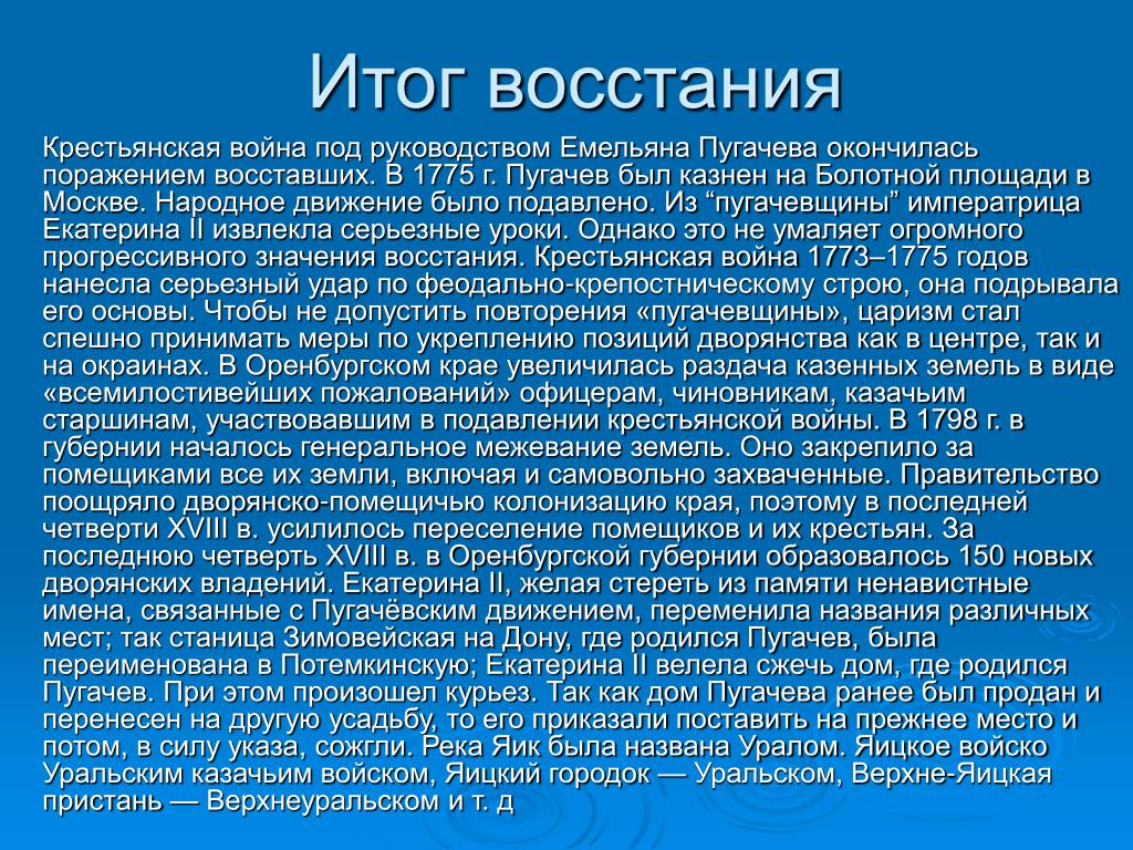 Восстание приближалось к своему завершению, многие это осознавали. Товарищи самозванца были готовы выдать его властям. Мужчина почувствовал скорое предательство и собрался сбежать в Персию, но не успел это сделать. Войска генерала Михельсона настигли его и взяли в плен. Пугачева отправили в столицу, где по указу Екатерины казнили. Чтобы хоть как-то сгладить память про это историческое событие, императрица решила переименовать реку Яик в Урал.