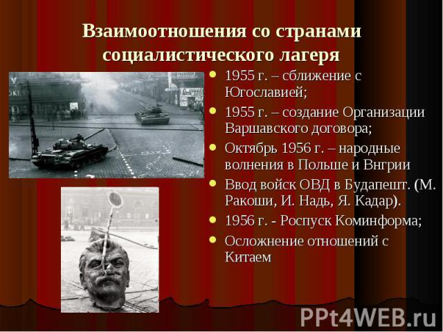 14 мая 1955 года в Варшаве был подписан Договор о дружбе, сотрудничестве и взаимной помощи представителями Албании, Болгарии, Венгрии, ГДР, Польши, Румынии, СССР и Чехословакии. Этот документ оформил создание военного-политического союза европейских социалистических государств – Организации Варшавского договора (ОВД), что стало ответной мерой на создание НАТО, нацеленного против стран социалистического лагеря.