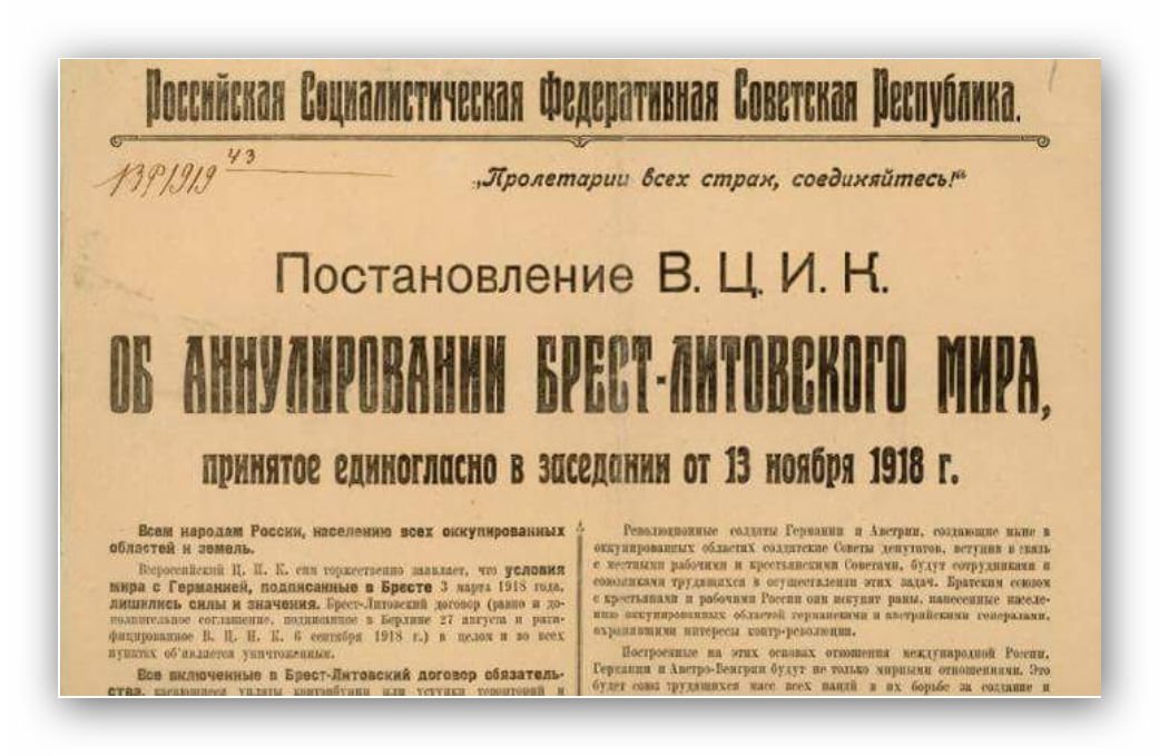 Брестский мир был подписан 3 марта 1918 года и аннулирован в ноябре 1918 года решением ВЦИК РСФСР.