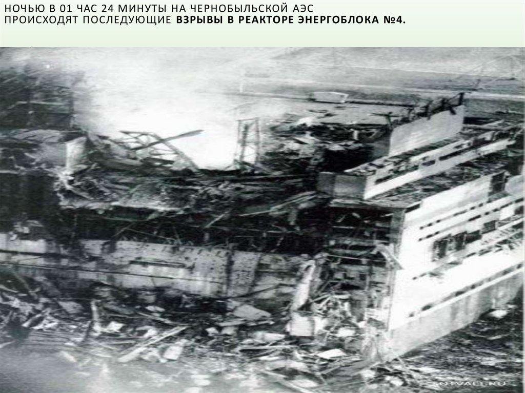 Авария произошла в 01:23 в субботу, 26 апреля 1986 г., когда два взрыва разрушили активную зону 4-го энергоблока и крышу реактора строительство.