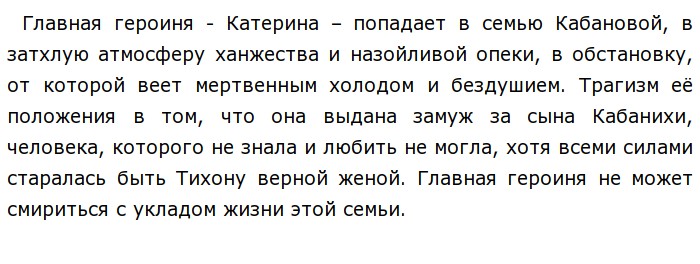 А. Н. Островского «Гроза», выросла в купеческой семье, в атмосфере любви и гармонии. «Маменька меня наряжала, как куклу, работать не заставляла» — вспоминала она. Но после того как девушка вышла замуж, жизнь переменилась. Мать мужа, ревнуя сына, постоянно унижала её. А Тихон, тоже страдавший от гнета матери, не защищал жену.