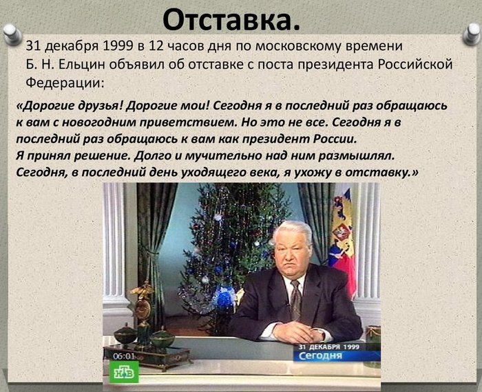 Во время второго срока страна погружается в очередной экономический кризис, случается дефолт, власти все больше недовольны президентом, а сам он стремительно теряет здоровье. В 1999 году Ельцин, после определенной чехарды, назначает исполняющим обязанности премьер-министра Владимира Владимировича Путина, а уже в конце этого года объявляет о своей отставке, не дожидаясь окончания президентского срока.