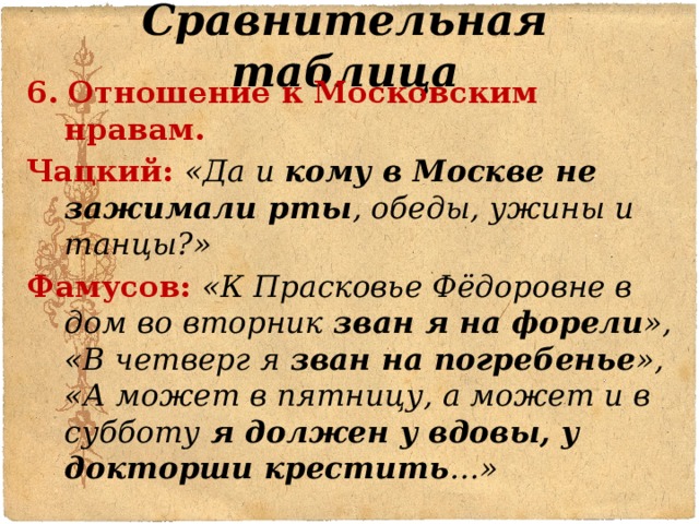 Всех этих людей объединяет одна точка зрения на жизнь: все они жесткие крепостники. Они считают торговлю людьми нормальным явлением. Крепостные искренне им служат, иногда спасают себе жизнь, а хозяева могут выменять крестьян даже на борзых собак… Главное для фамусовского общества — богатство. Идеалы для них – люди высокого ранга.