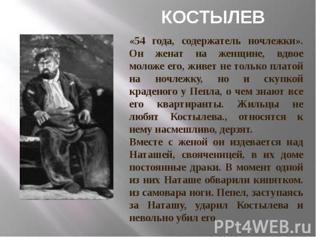 - Хозяева Характеристика литературного героя Это хозяин ночлежки Костылев и его жена Василиса.