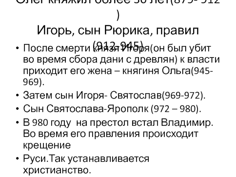 Воспитанник Олега — князь Игорь После смерти князя Олега в Киевской Руси в 912–945 годах княжил сын Рюрика — Игорь. Воспитанный варяжским витязем, Игорь, очевидно, перенял от Олега отношение к Царьграду и как к вожделенному источнику обогащения, и как к плацдарму для