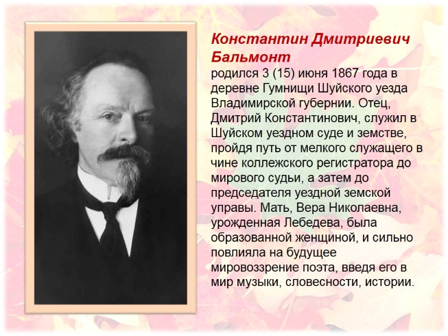 К. Д. Бальмонт родился в селе Гумнищи (Владимирская губерния) 15 июня 1867 года в семье судьи. Мать с ранних лет прививала мальчику любовь к музыке и литературе. Спустя некоторое время семья переехала в город Шуя, где в 1876 году Бальмонт пошел в Шуйскую гимназию. Константина исключили из гимназии за революционные настроения. Бальмонт переводится в город Владимир и заканчивает заведение в 1886 году. В этом же году он принял решения поступать в Московский университет на факультет юрисдикции. Но и здесь его, спустя год обучения, исключили за участие в студенческих беспорядках.