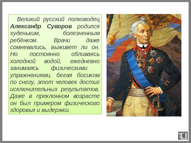Суворов — гений воинского искусства. Он участвовал в шестидесяти трех битвах и не проиграл ни одной. Начал службу простым капралом, а закончил генералиссимусом.