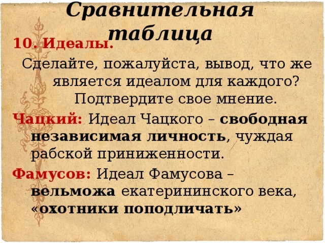 Молчалин является полной противоположностью Чацкого. У него совсем другие идеалы. Цель его жизни – карьера, высокое положение в обществе, богатство.