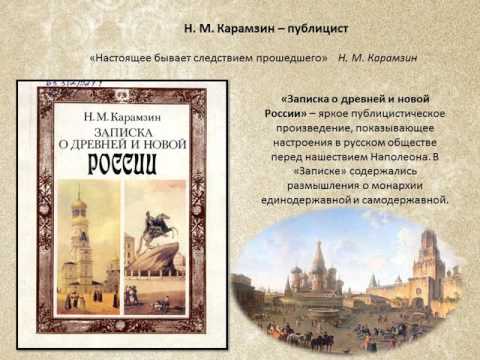 Его главный труд недаром назван «Историей государства Российского», а не историей России, потому что в понятие «государство» Карамзин вкладывал смысл поступательного развития России под началом мудрого государственного деятеля. Карамзин призывал к постепенному, мирному движению общества вперёд, без насилия и кровопролитных реформ, путь от старого – к новому, но всегда имея в запасе это старое. !Наша история, по мнению Карамзина, должна строится не по энциклопедии, рождённой в Париже, а по энциклопедии более древней – по Библии».