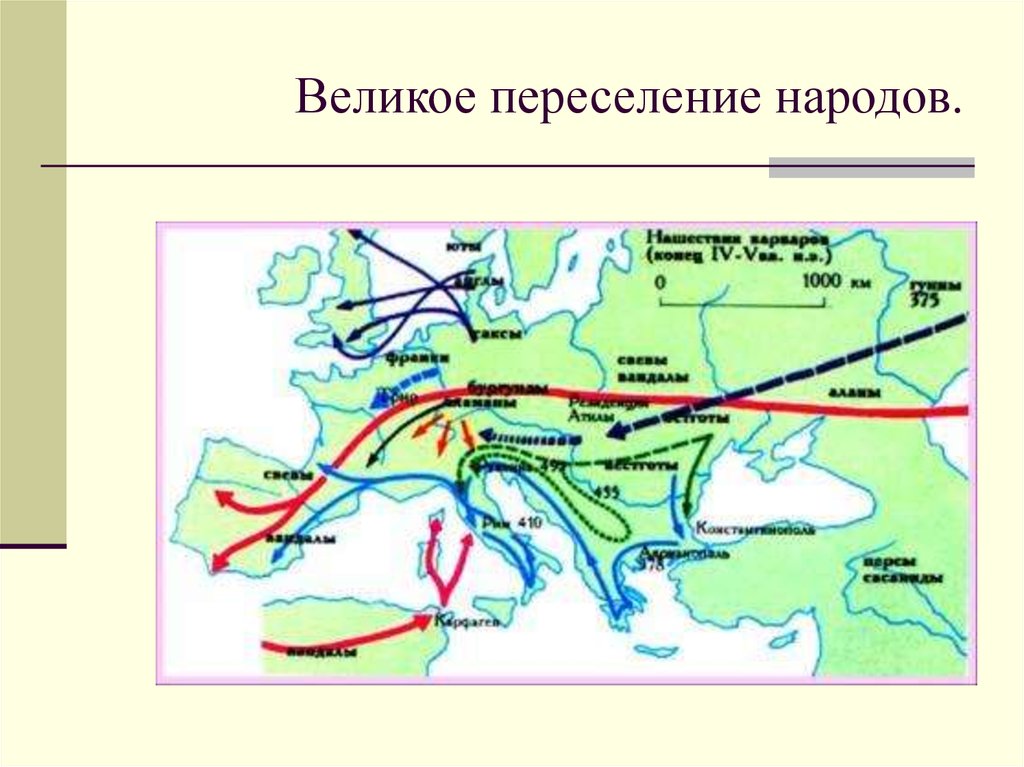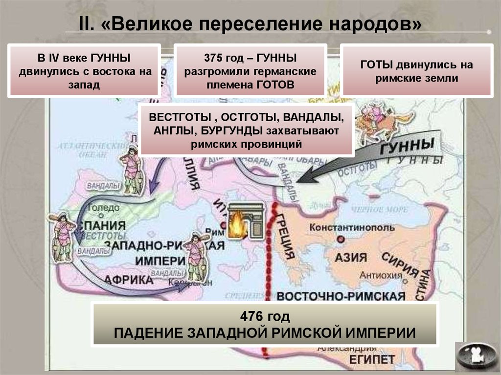 С запада, из Прибалтики, большой массой проникли на восток древнегерманские племена и встретили на своем пути еще более сильное течение кочевников с востока. Последние шли в противоположном направлении, то есть на запад. Эти два течения столкнулись, перемешались и составили новый мощный поток, в котором направляющую роль сыграли кочевники – гунны. Переселение захватило всю Восточную и Западную Европу, вызвав новое перемещение племен, в результате чего возникли новые этнические массивы и объединения.