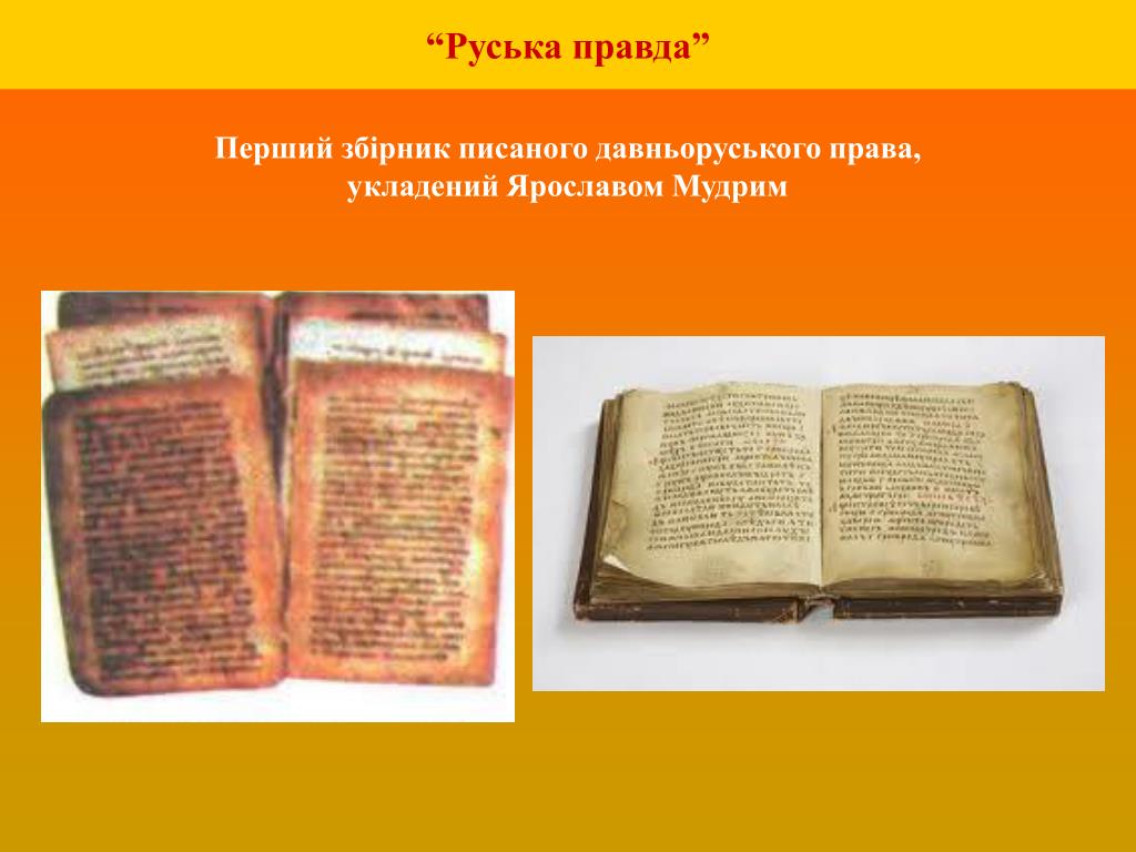 Первая кодификация традиционных правовых норм, согласно наиболее распространенной точке зрения, была проведена Ярославом Владимировичем (1016-1018, 1019-1054) после утверждения на киевском престоле.
