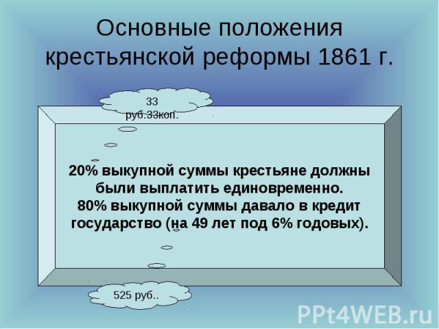 Согласно Положению 19 февраля 1861 года крестьяне перестали считаться крепостными и получили статус временнообязанных (до заключения с помещиком договора о переходе на выкуп). Вся земля в имениях, включая крестьянские приусадебные участки, признавалась собственностью помещиков. Собственностью бывших крепостных были признаны их дома, постройки и все движимое имущество. Приусадебную землю надо было выкупать у помещиков индивидуально, а полевую надельную землю – коллективно. Последняя предоставлялась в пользование не лично крестьянам, а сельскому обществу (общине), которое по договоренности распределяло ее между всеми крестьянами. Когда сельское общество, являвшееся как до, так и после реформы органом крестьянского самоуправления, заключало с помещиком договор о выкупе земли, все обязательства крестьян перед ним прекращались.
