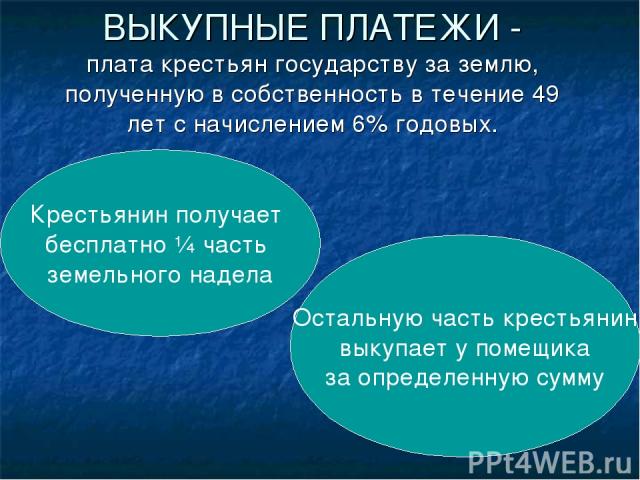 Выкуп крестьянами, вышедшими из крепостной зависимости, земельных наделов у помещиков. Правительство выплатило помещикам основную часть суммы выкупа, но это рассматривалось как ссуда, которую крестьяне должны были погасить в течение 49 лет (с процентами). В 1907 году выкупные платежи были отменены, недоимки по ним прощены.