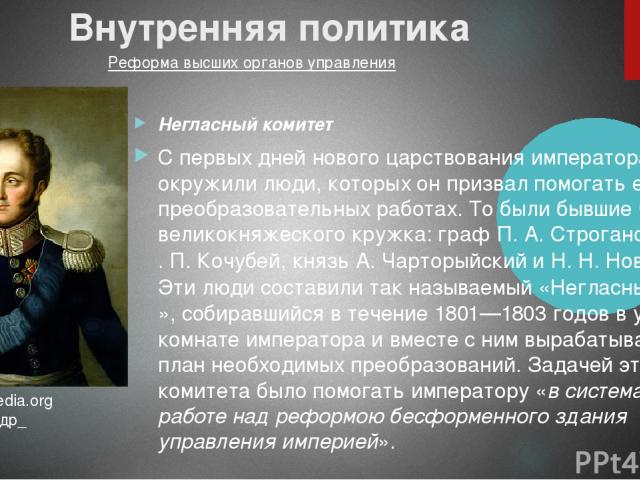 Как только он стал царем, Александр применил свои знания, собрав своих ближайших и наиболее просвещенных друзей-аристократов на совет, который поставил перед собой далеко идущие либеральные реформы. Александру казалось, что нет никаких причин, по которым России нельзя было бы дать конституцию или искоренить крепостное право за несколько лет; в конце концов, кто был лучше подготовлен для осуществления таких вещей, чем абсолютный монарх? Он не был связан ни градуалистским прецедентом Екатерины, ни тем более дисциплинарным милитаризмом Павла и Петра. Россия под его руководством наконец станет страной свободных людей.