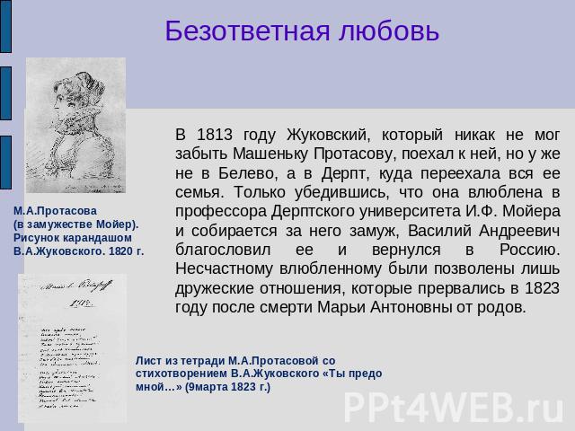 В этот период Жуковского связывали романтические отношения с его дальней родственницей. Но в 1802 году ее выдали замуж за состоятельного дворянина.