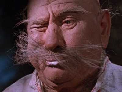 Перед ним стоят две миски, одна со сметаной, другая с варениками, и Пацюк, не прикасаясь руками, взглядом направляет вареники в сметану, затем раскрывает рот, куда сам собой залетает вареник. От удивления Вакула открывает рот, и один из вареников попадает туда.